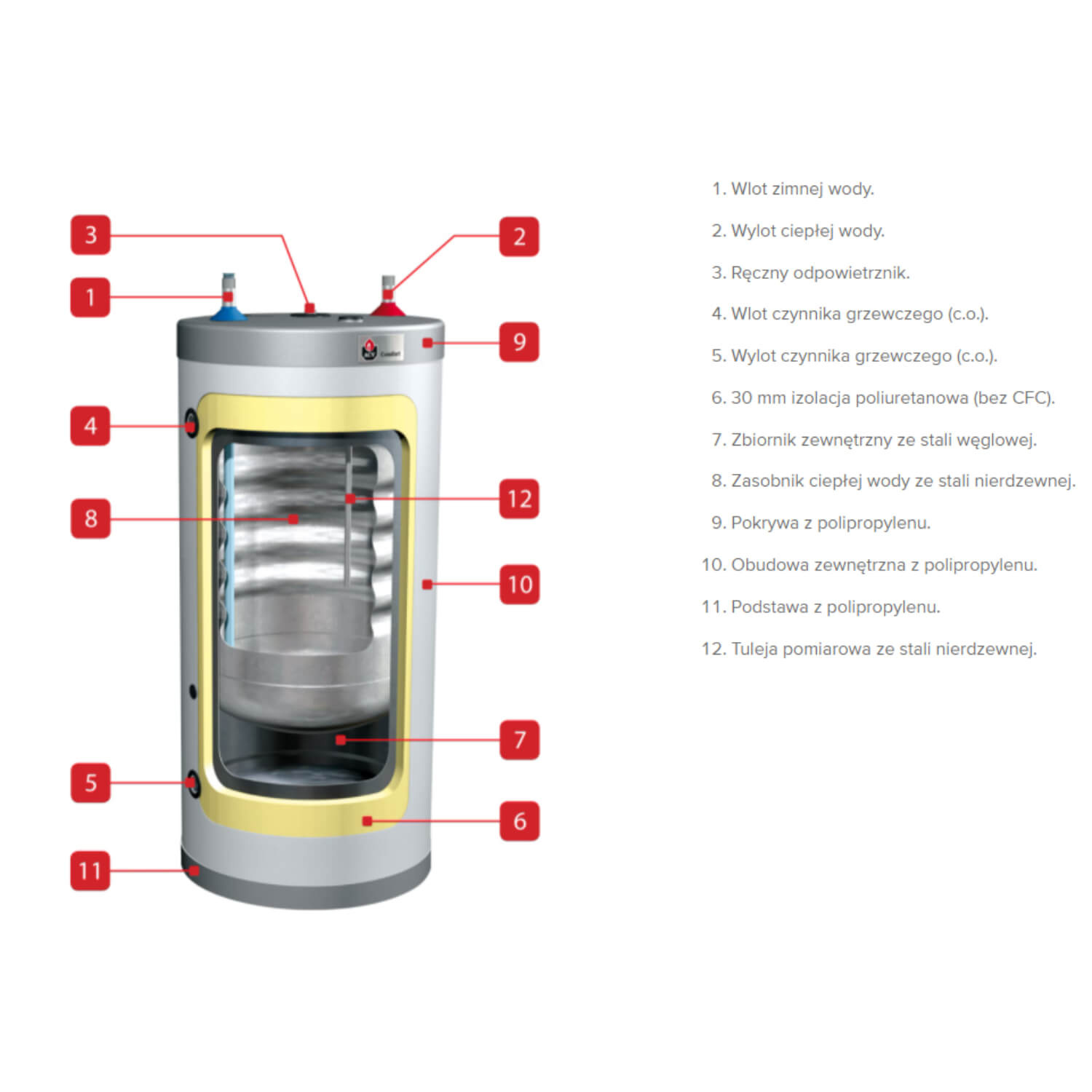 Wymiennik ciepłej wody użytkowej Comfort 100 to nowoczesny i wydajny wymiennik cwu 100l, przeznaczony do komfortowego podgrzewania c.w.u. w instalacjach domowych. Urządzenie bazuje na innowacyjnej konstrukcji „zbiornik w zbiorniku”, która zapewnia bardzo szybkie i efektywne wymiany ciepła oraz wysoki komfort użytkowania.
