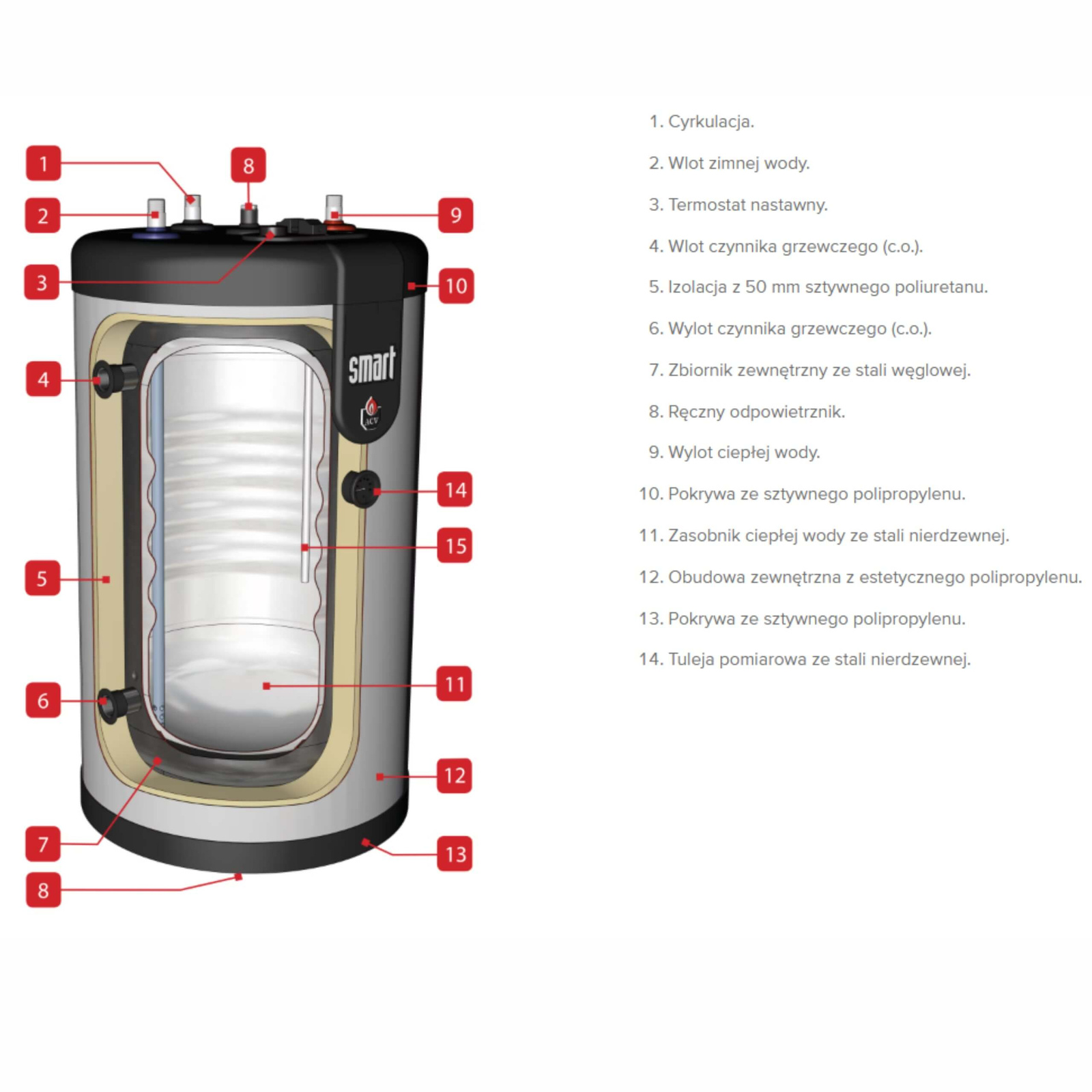 ACV SMART 160 zasobnik c.w.u. 784200 wykonany ze stali nierdzewnej, pojemność 161 litrów, izolacja poliuretanowa, termostat, termometr, króciec cyrkulacyjny, do współpracy z kotłami wodnymi.
