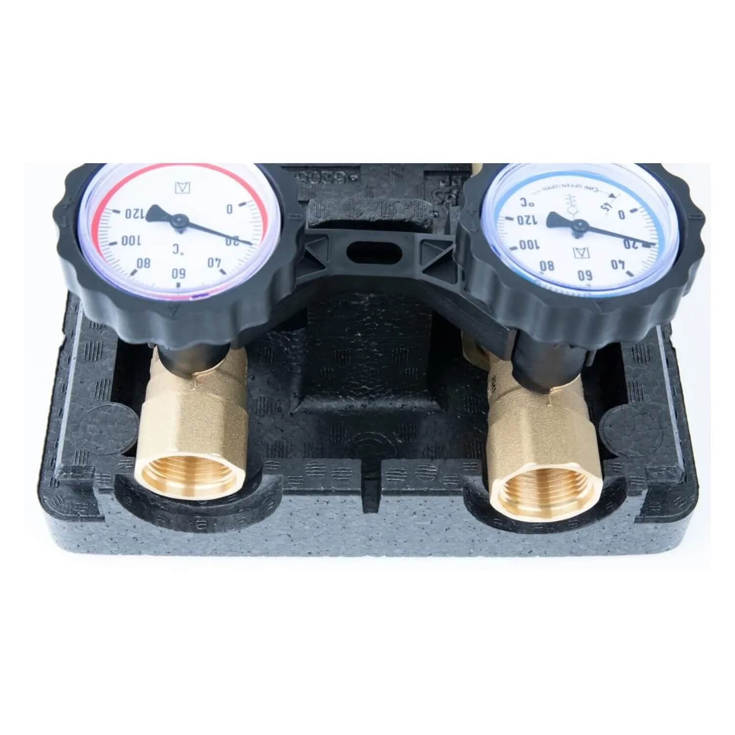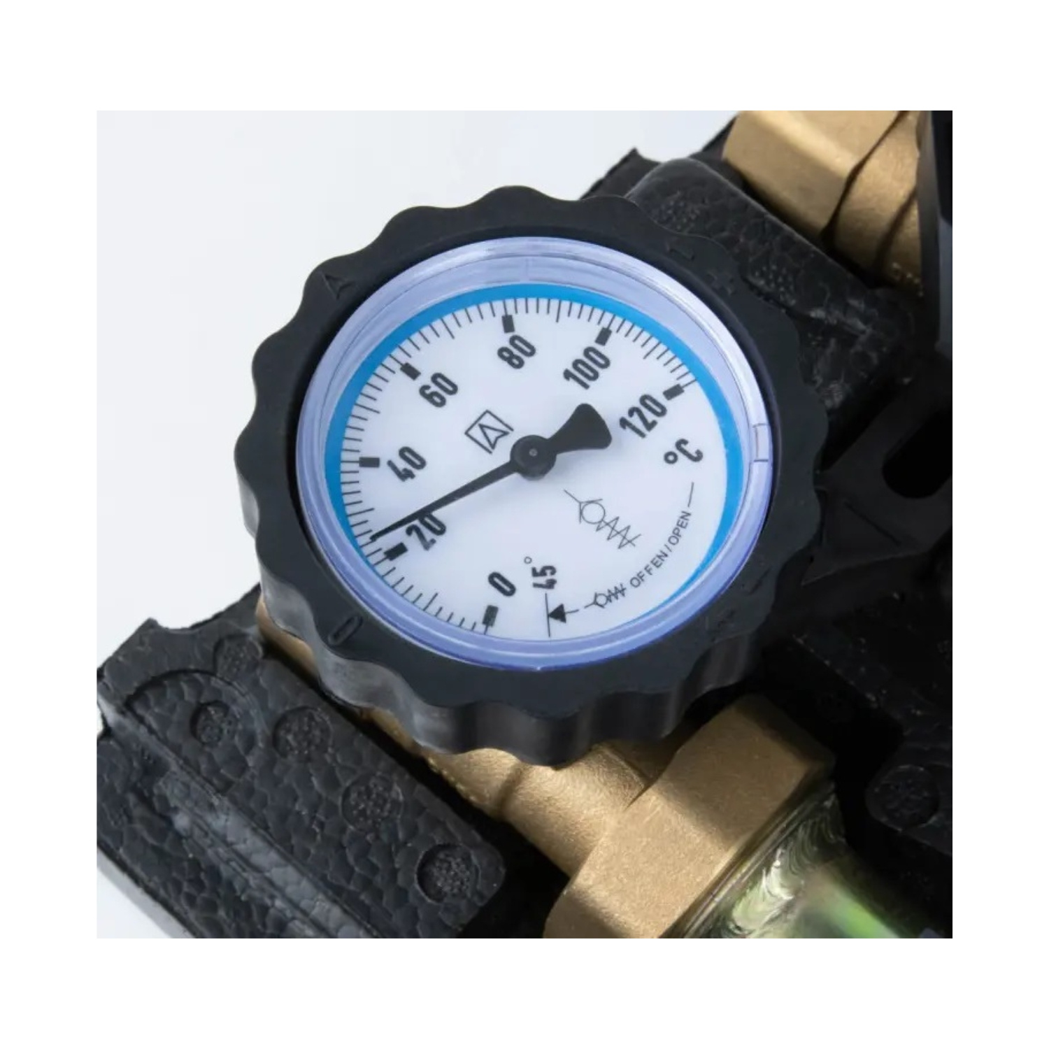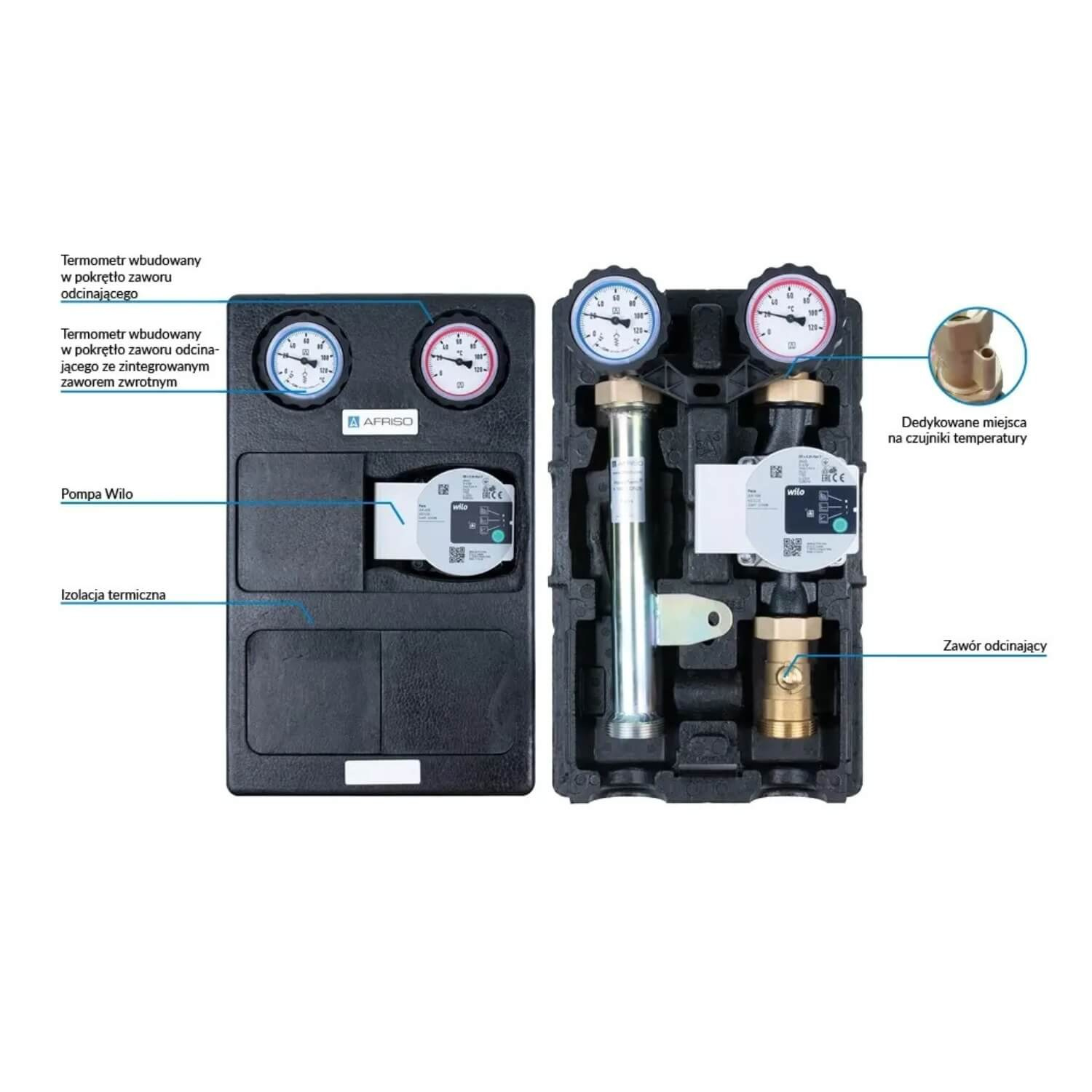 PrimoTherm charakteryzuje się kompaktową konstrukcją i wysoką funkcjonalnością. Wyposażona jest w termometry, zawór zwrotny, zawory odcinające na zasilaniu i powrocie oraz izolację termiczną. Kluczowymi elementami są zawór mieszający ARV Kvs12, pompa Wilo Para SC 25/6 oraz siłownik ARM 343 ProClick (3-punktowy, 230 V, 120 s), zapewniające precyzyjną kontrolę i wysoką wydajność. Możliwość zamiany miejscami przewodów zasilających i powrotnych ułatwia montaż i konserwację.