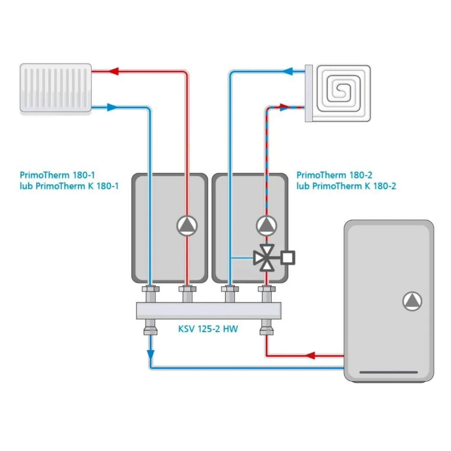 Grupa pompowa PrimoTherm to wszechstronne rozwiązanie do instalacji grzewczych i chłodzących. Zapewnia efektywne przetłaczanie medium oraz precyzyjną regulację temperatury zasilania obiegu grzewczego. Może być montowana na rozdzielaczu KSV, buforze ABT 160 lub funkcjonować jako niezależny komponent.