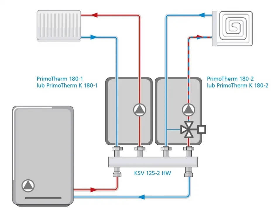 - Przeznaczony do szybkiego i wygodnego podłączenia dwóch grup pompowych PrimoTherm do źródła ciepła.