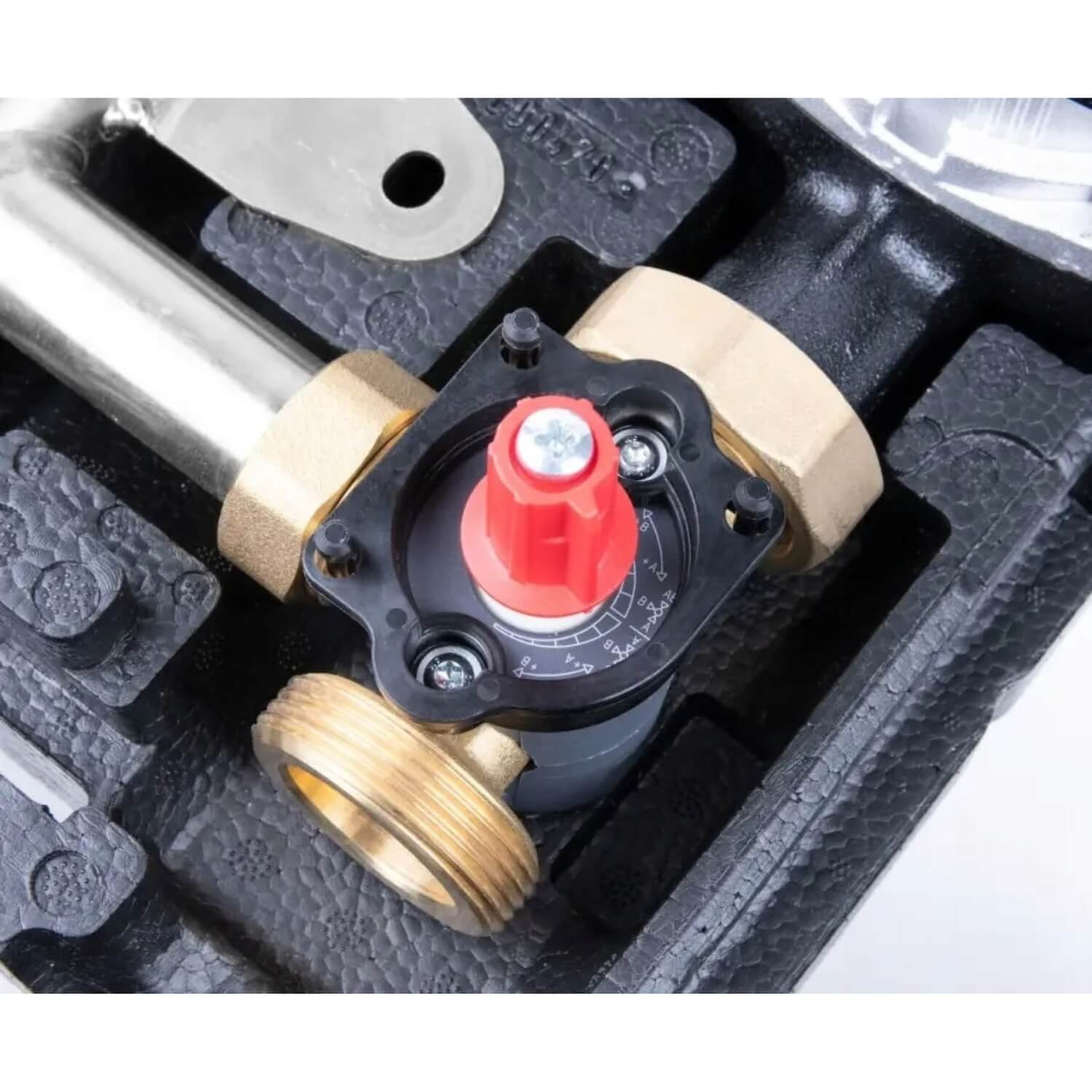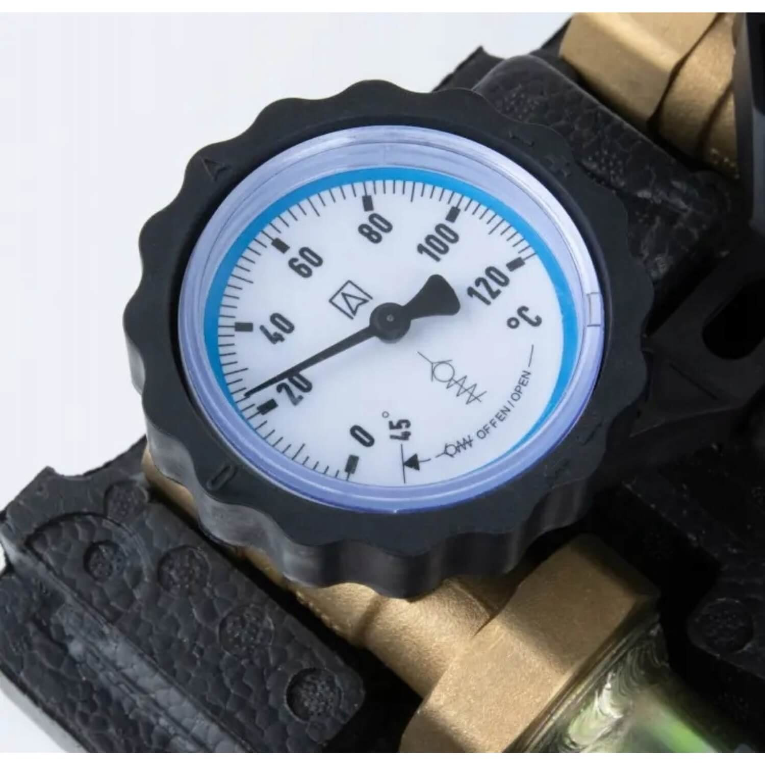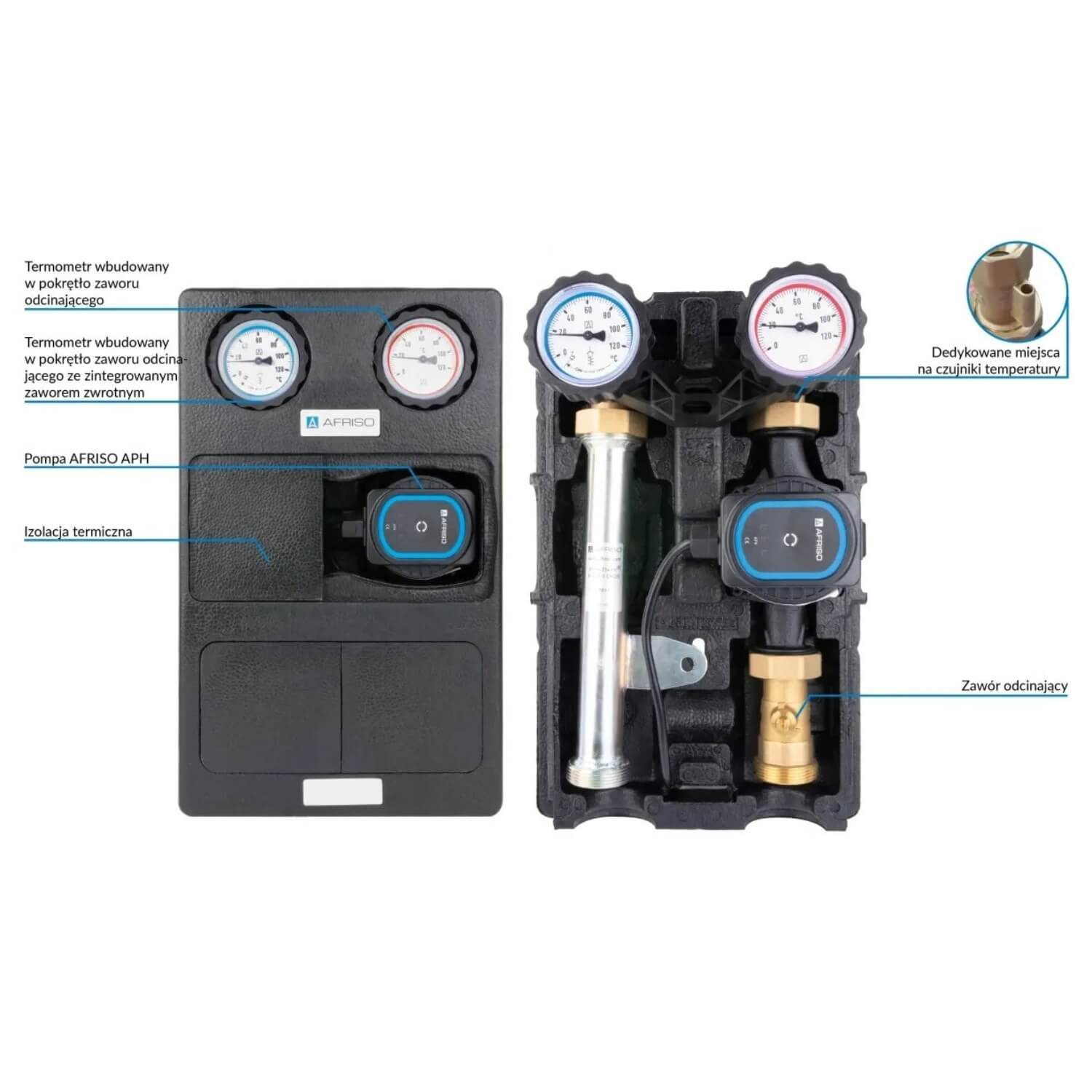 • Wyposażenie: termometr, zawór zwrotny, zawory odcinające na zasilaniu i powrocie, izolacja termiczna