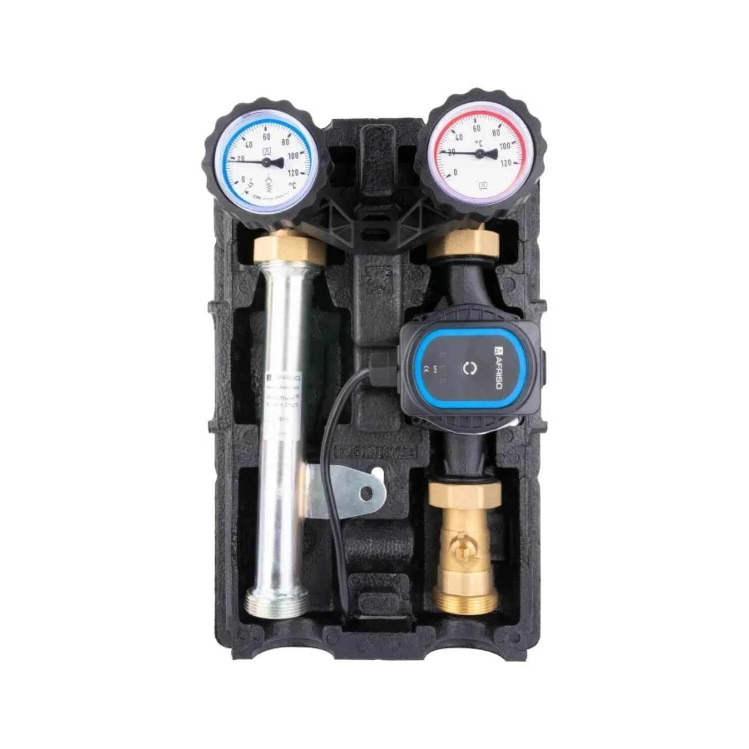 Zestaw ten to kompleksowe rozwiązanie dla profesjonalnych instalacji grzewczych i chłodzących. Składa się z dwóch grup pompowych PrimoTherm K 180-1 DN25 i PrimoTherm K 180-2 DN25, pompy AFRISO APH oraz rozdzielacza AFRISO KSV 125-2.