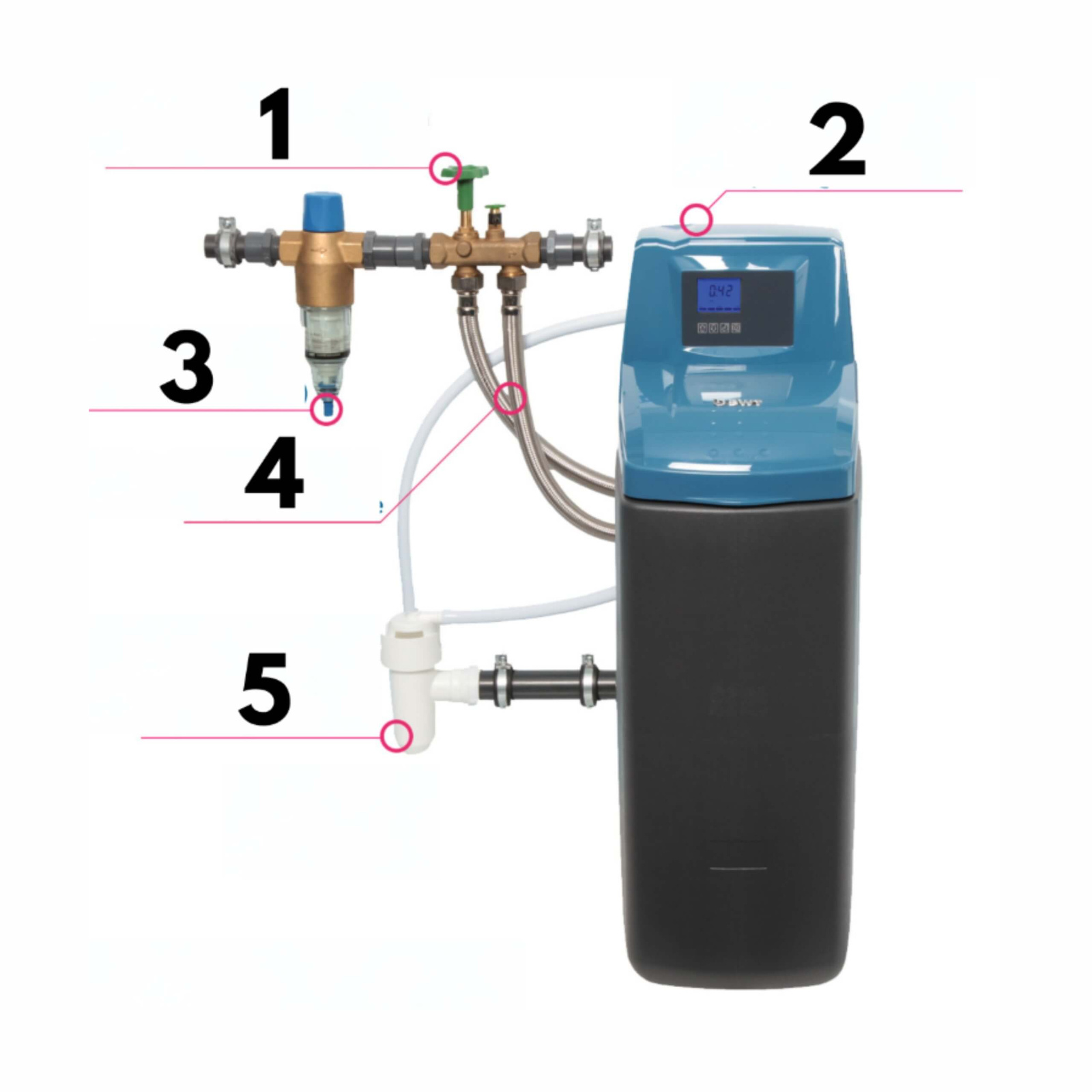 W zestawie i elementach instalacji znajdują się: armatura przyłączeniowa, zmiękczacz, filtr mechaniczny, węże przyłączeniowe oraz syfon do odprowadzania popłuczyn.