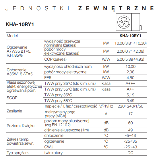 - Zakres temperatury zewnętrznej w trybie grzania: -25–35°C