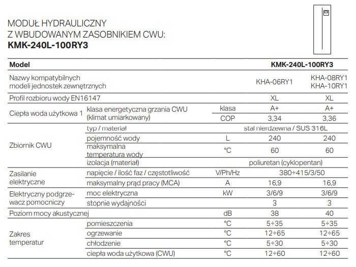 - Jednostka wewnętrzna wyposażona w moduł hydrauliczny ze zbiornikiem na ciepłą wodę użytkową o pojemności 240 litrów.