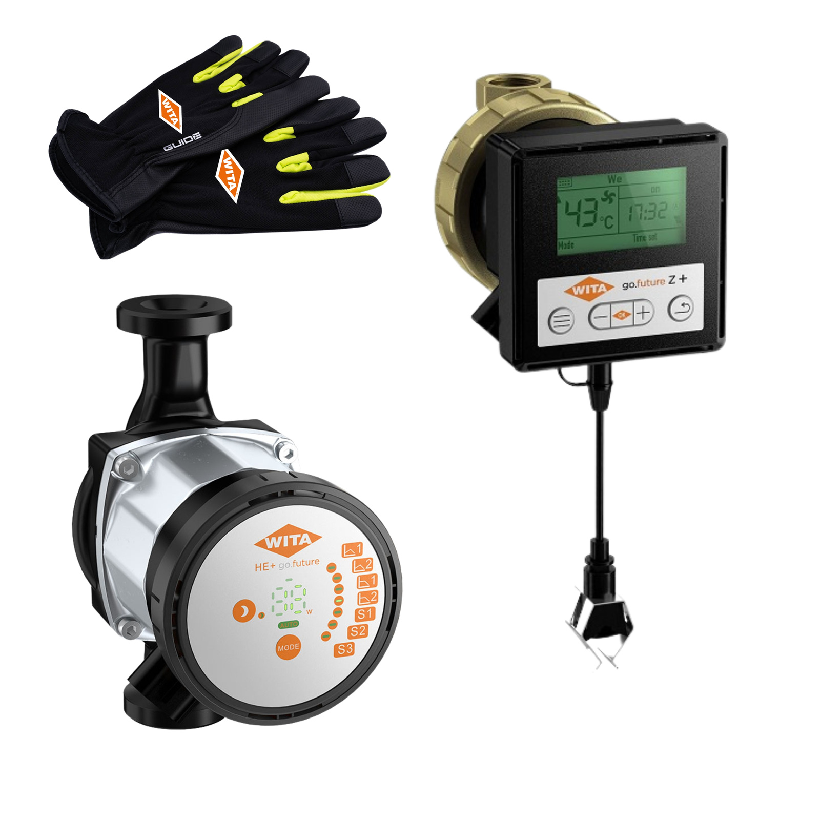 Zestaw dwóch pomp WITA: energooszczędna pompa obiegowa HE+ go.future 40/60 oraz pompa cyrkulacyjna Z+ 15 ½" IG, uzupełniony o gratisowe rękawiczki robocze. Idealne do instalacji CO i CWU w super cenie.